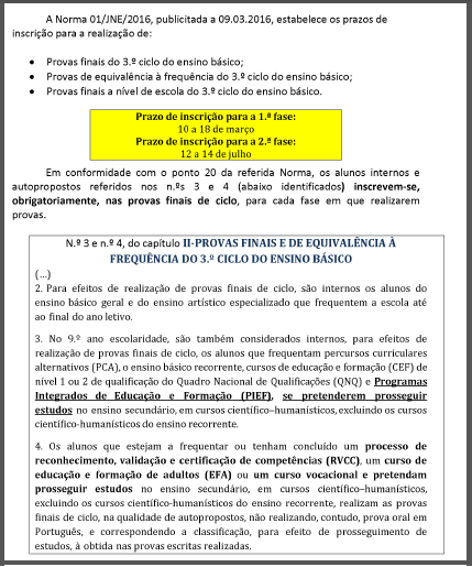 Publicamos mais alguns documentos relativos aos exames e provas de 2016: -Aviso com os prazos de inscrição para as provas do Ens. Básico - 9º ano; -Aviso com os prazos de inscrição para as provas do Ens. Secundário; -Regulamento de Exames; -Norma 1 /JNE / 2016 - Instruções para a Inscrição nas Provas e Exames do 3.º ciclo do Ensino Básico e do Ensino Secundário