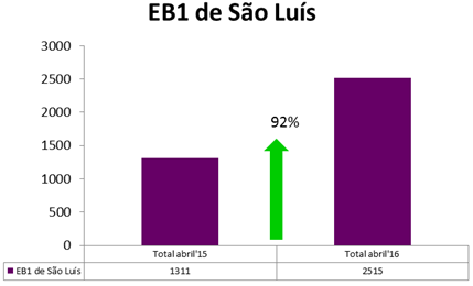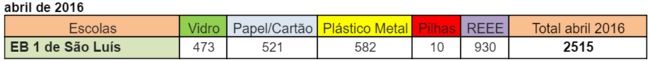 Já estão disponíveis para consulta no site da ALGAR, em www.algar.com.pt, os resultados finais do Concurso “Vamos dar Vida aos Resíduos” 2016. Mostramos de seguida as quantidades recolhidas em abril e por material, os valores acumulados entre dezembro de 2015 e abril de 2016, um gráfico com o crescimento de 92% (nas quantidades de recicláveis encaminhados para valorização pela EB1 SL) e outro gráfico que mostra o excelente 3º lugar da escola de S. Luís no Rankig das escolas.