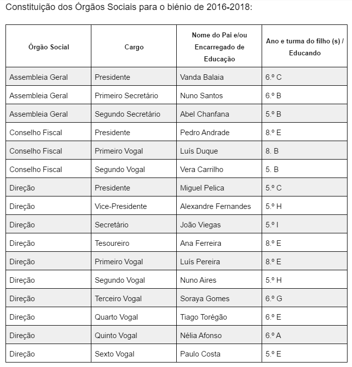 Constituição dos Órgãos Sociais para o biénio de 2016-2018: