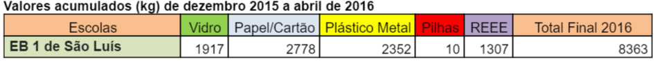 Já estão disponíveis para consulta no site da ALGAR, em www.algar.com.pt, os resultados finais do Concurso “Vamos dar Vida aos Resíduos” 2016. Mostramos de seguida as quantidades recolhidas em abril e por material, os valores acumulados entre dezembro de 2015 e abril de 2016, um gráfico com o crescimento de 92% (nas quantidades de recicláveis encaminhados para valorização pela EB1 SL) e outro gráfico que mostra o excelente 3º lugar da escola de S. Luís no Rankig das escolas.