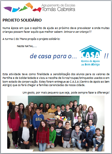 Numa época em que o espírito de ajuda ao próximo deve prevalecer e onde muitas crianças possam fazer aquilo que melhor sabem: brincar e ser criança!!! A turma C do 7º ano propôs o projeto solidário: Neste NATAL.... Esta atividade teve como finalidade a sensibilização dos alunos para os valores de Partilha e de Solidariedade e visou a recolha de livros/roupas/brinquedos usados e em bom estado de conservação. Estes foram entregue ao C.A.S.A (Centro de Apoio ao Sem Abrigo) que os fará chegar a famílias carenciadas da nossa cidade. Um gesto, por mais pequeno que seja, pode sempre fazer a diferença! |